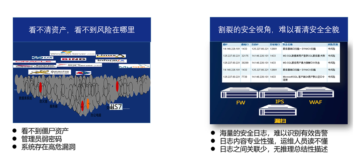 缺乏主動資産與脆弱性識别,安全設備相(xiàng)互割裂、難以深度關聯分(fēn)析,缺乏全局安全視(shì)角