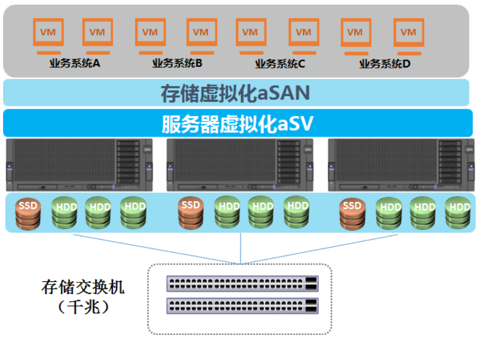 經過對(duì) VMware、深信服、華為(wèi)等方案的(de)考察,該集團最後¥選用(yòng)我公司提供的(de)深信服超融合解決方案進行(xíng)數(shù)據中心的(de)升級改造。整個(gè)項目采用(yòng)了(le)3台配置 2*E5-2660V3/256GB內(nèi)存/2*480GB SSD,6*4TB SATA,超融合一(yī )體(tǐ)機(jī)。同時(shí)采用(yòng)兩台獨立的(de)千兆交換機(jī)作(zuò)為(wèi)分(fēn)布式存儲的(de)數(shù)據同步通(tεōng)道(dào)。在3台服務器(qì)搭建起的(de)超融合資源池中,采用(yòng)P2V的(de)方式,将原有(yǒu)30+個(gè)物(wù")理(lǐ)服務器(qì)系統遷移到(dào)虛拟機(jī)當中;業(yè)務系統包括Exchange服務器(qì),OA服務器(♥qì)、用(yòng)友(yǒu)ERP系統等。